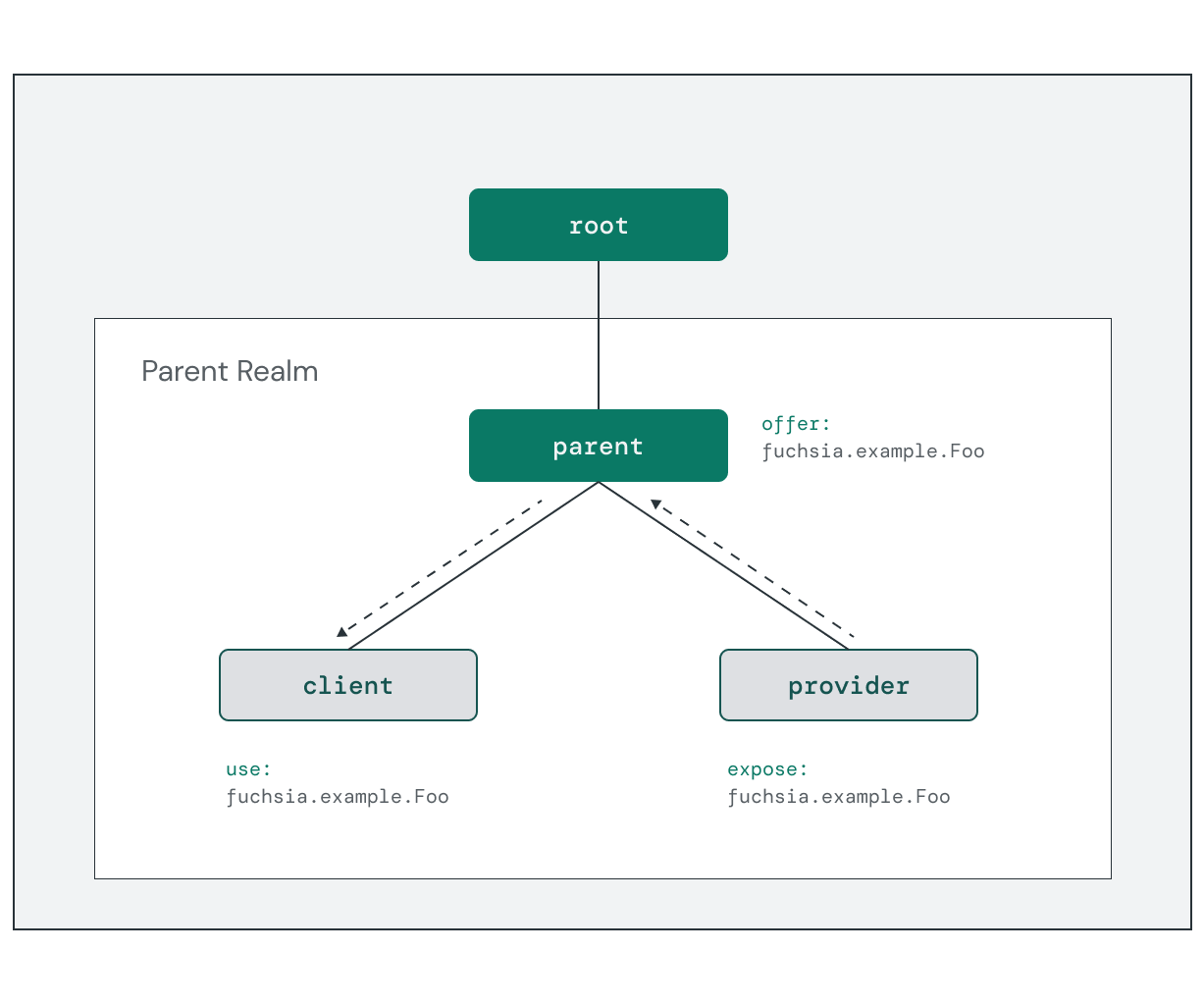 任何父項元件及其所有子項都會在樹狀結構中形成一個稱為「realm」的群組。Realms 可讓上層控制哪些功能流入及流出其元件子樹狀結構,藉此建立能力邊界。元件會決定是否要使用 expose 關鍵字,將功能匯出至其領域之外: